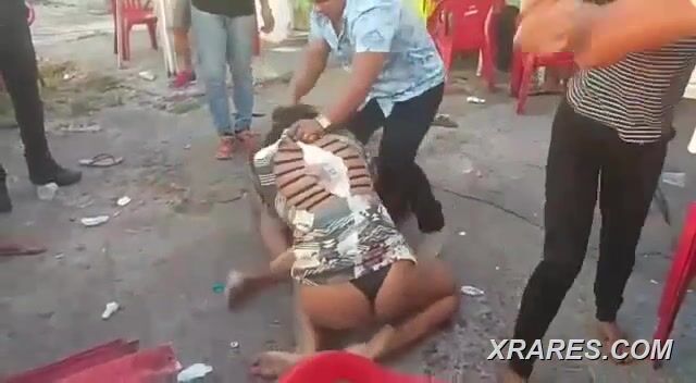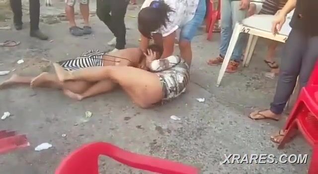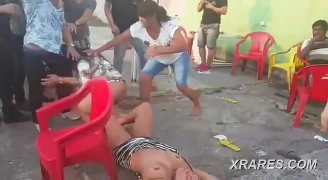 2 ladies fighting naked in public, showing breasts